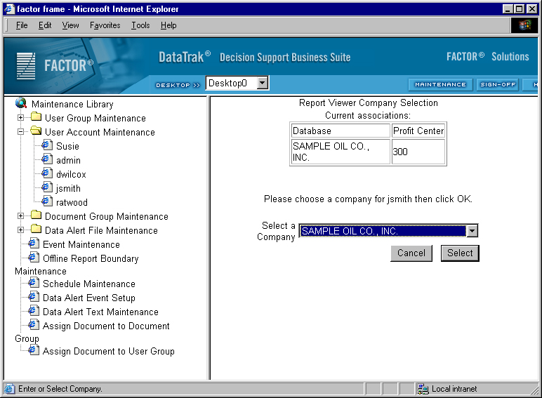This form lets you specify the company databases to which a user has access. The top part of the form displays currently assigned company databases. To add a new company, select the company name from the dropdown list and then click the Select button. Note: Each user can be granted access to multiple databases.